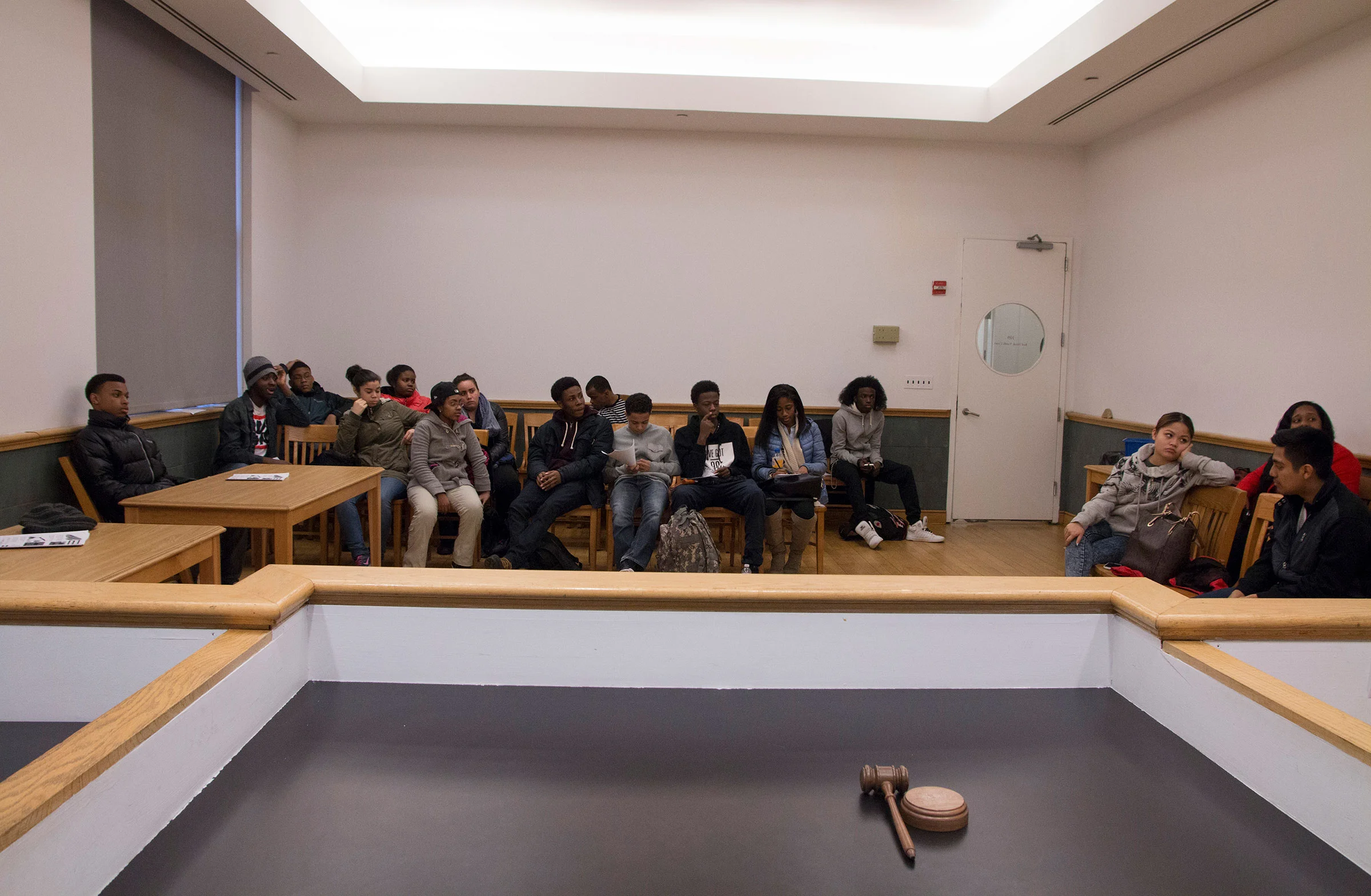 In the white-walled courtroom, Ann acts as judge (last names have been left off to protect minors’ privacy.) The petite 17-year-old sits in the center of the courtroom behind a large judge’s bench that consumes her. The defendant, a teen with long straight black hair slouches in the testimony box to her right. His offense: skipping school.